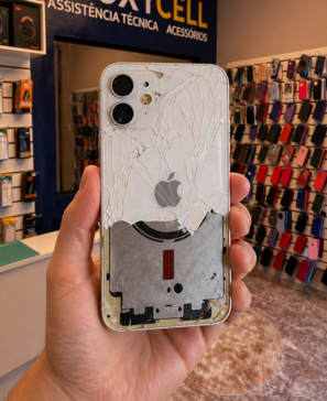 Substituição de tampa traseira com acabamento cuidadoso, restaurando a estética e a proteção do aparelho.