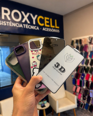 Variedade de acessórios para proteção e uso do seu dispositivo, como capas, películas, carregadores e cabos, com diferentes modelos e opções.